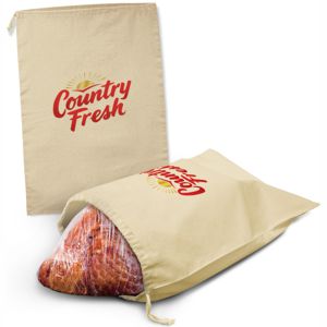 A handy drawstring bag for storing ham in the refrigerator. It is manufactured from 140gsm unbleached natural cotton and extends the life of a ham by reducing moisture loss and allowing it to breathe. Cotton is a natural resource and is easy to wash ensuring the bag can be reused many times. A branded Ham Storage Bag is the perfect way to present a gifted ham. It adds perceived value to the gift and the recipient can reuse the branded bag for many years to come. Decoration is by screen printing or CMYK full colour printing. Minimum order: 100 Lead time: 2 weeks