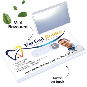 > - What a handy product to tuck into your pocket or handbag. It's a terrific promotional item to give your clients or staff. Business card size dental floss card with mirror on back, includes 10metres of mint flavoured floss. Decoration is by pad printing or CMYK full colour digital direct printing.