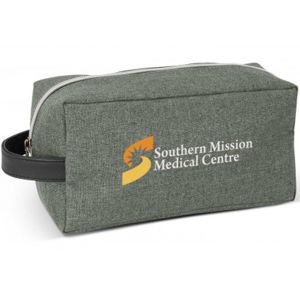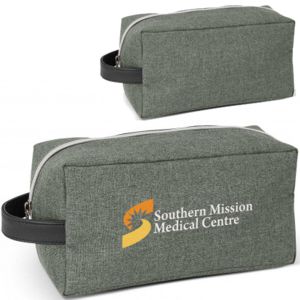 Toiletry bag with a carry handle and a smart shiny chrome zip. It is manufactured from poly-canvas with an on-trend heather style finish. This is a fantastic gift for clients, promotional giveaways or for staff travel! Decoration is by screen printing or CMYK full colour printing. Minimum order: 50 Lead time: 2 weeks